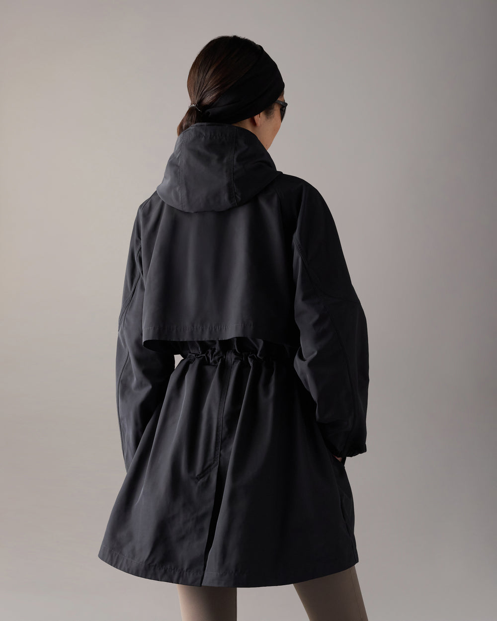 Our breathable Memory fabric lends water-repellent and wind-resistant qualities to the protective silhouette, which is designed with a hood and an adjustable waist for a sculpted fit ideal for spring layering.