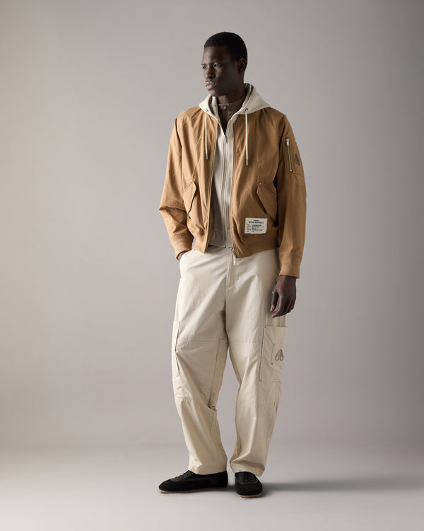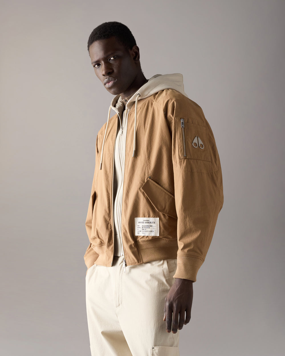 Cut in airy cotton, this men’s bomber is designed with a relaxed fit and a contrast zip-out hooded fooler for versatile layering, finished with a Moose Airlab patch and antiqued hardware.