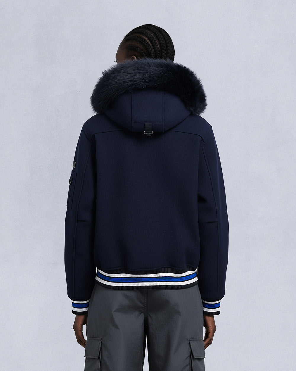 - Removable Hood with Removable Shearling Trim And Pom Poms