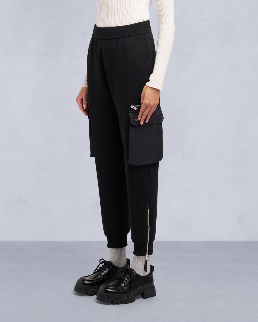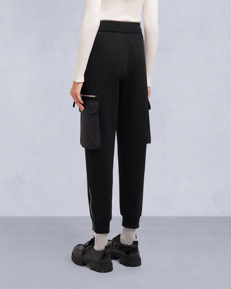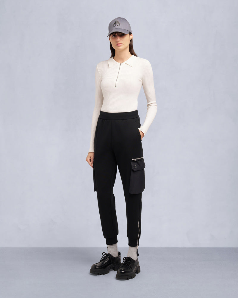 - Rib Knit Waistband with Drawstring on Interior, Rib Knit Cuffs, and Zipper Opening at Pant Leg